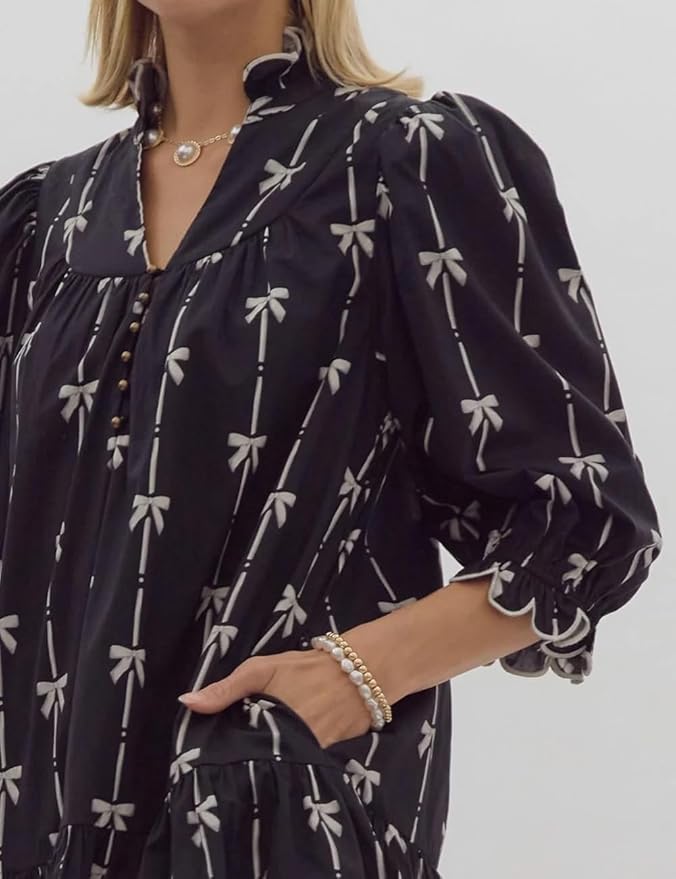 - This ivory dress features a ruffle v-neckline, charming puff sleeves and a flattering mini length, elastic cuffed three-quarter length sleeves, a black bow print throughout, and two functional hip pockets.