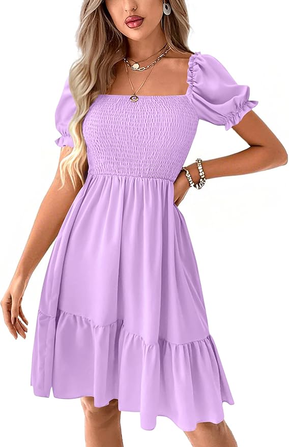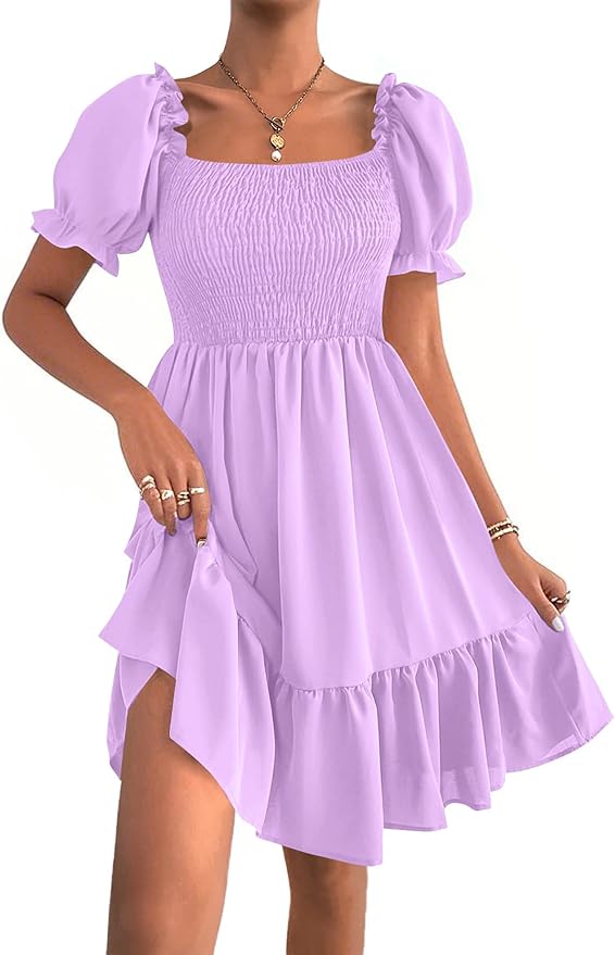 - Features: Square neckline, shirred, puff sleeves, a line, high waist, ruffle hem, layered casual mini dress.The unique design emphasizes the elegant temperament.
