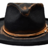 “Night Sky custom burned flat brim wool felt cowboy hat” is hand-distressed, hand-dyed, and hand-torched, ensuring no two share the same color or design. Each piece is uniquely imperfect, with subtle variations from product images.