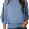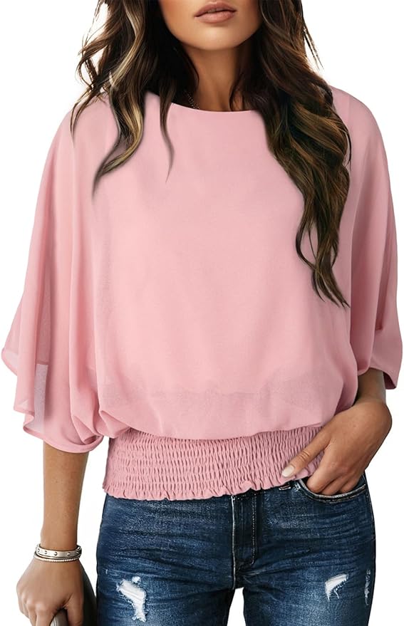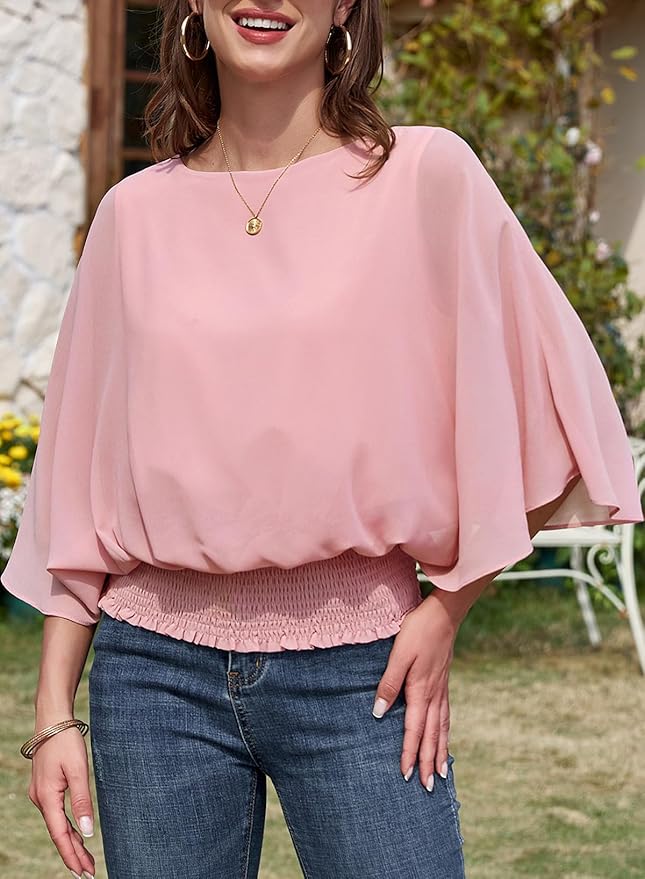 - Features: This casual chiffon blouses for women with classic boat crew neck, normal 3/4 sleeve, cute smocked waist,chiffon materail create for a flowy style.
