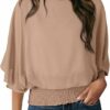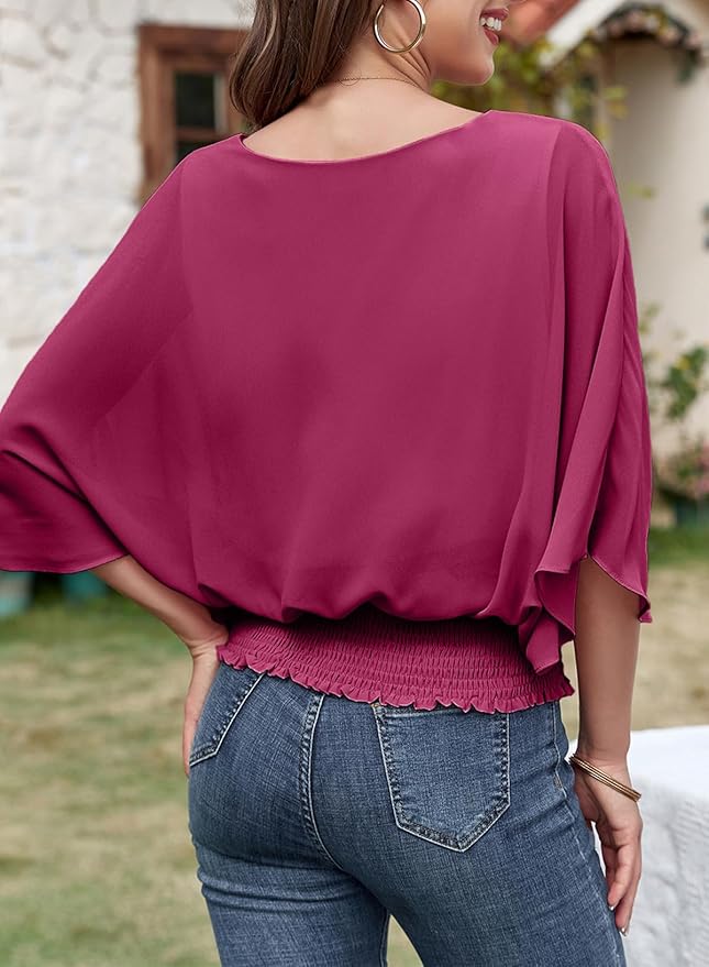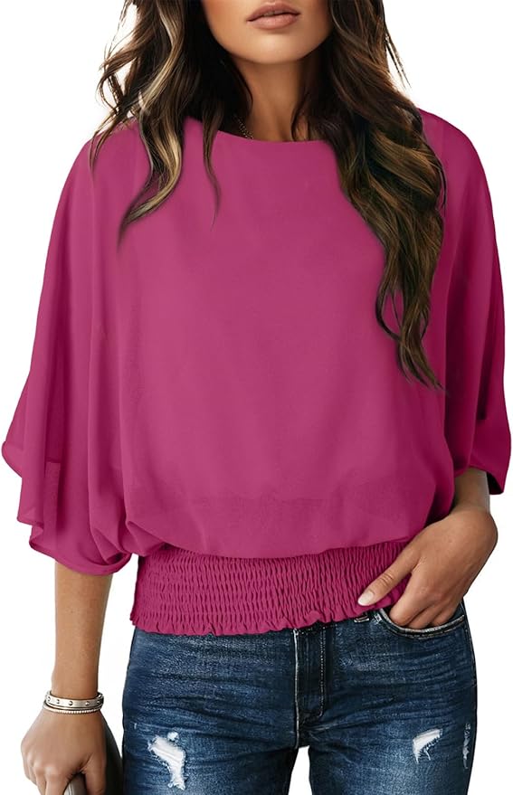 - Features: This casual chiffon blouses for women with classic boat crew neck, normal 3/4 sleeve, cute smocked waist,chiffon materail create for a flowy style.