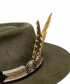 The “Rustic Rebel” fedora in a striking green color with a short brim, featuring 2 feathers and a unique band loop. This hat exudes a rugged yet rebellious charm, perfect for those who dare to defy convention and embrace their individuality.