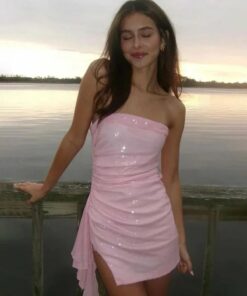 Shine bright in this pink sequin sheath mini dress, crafted to make every entrance unforgettable. The strapless neckline frames your shoulders with effortless elegance, while the sleek sleeveless silhouette keeps the look fresh and modern. Fully adorned with shimmering sequins, she catches the light from every angle, ensuring you sparkle in every step.