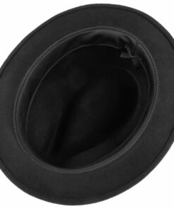 Supple wool felt gives this hat its pleasant feel and, together with a skin-friendly lining made of cotton, makes it comfortable to wear. The plain design of the felt hat with narrow brim is complemented by a subtly striped grosgrain ribbon trim with brand pin, which emphasises the hat’s neat charm. This trilby can be worn on everyday outings, but also makes a great club hat.
