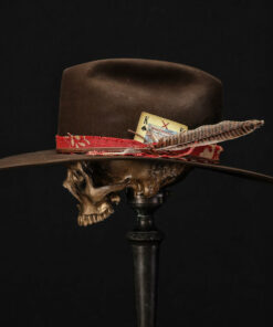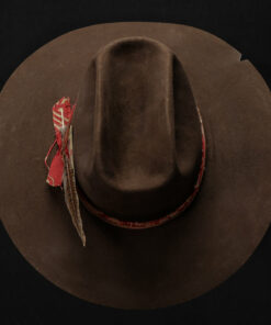 A road warrior for sure! This 100X Beaver Cattleman in Dark Brown is solid with its subtle and deadly trail breaker brim. Wrapped in American dead stock fabric and finished with a nice big feather and a Winchester rifles collectors card tucked in the side.