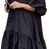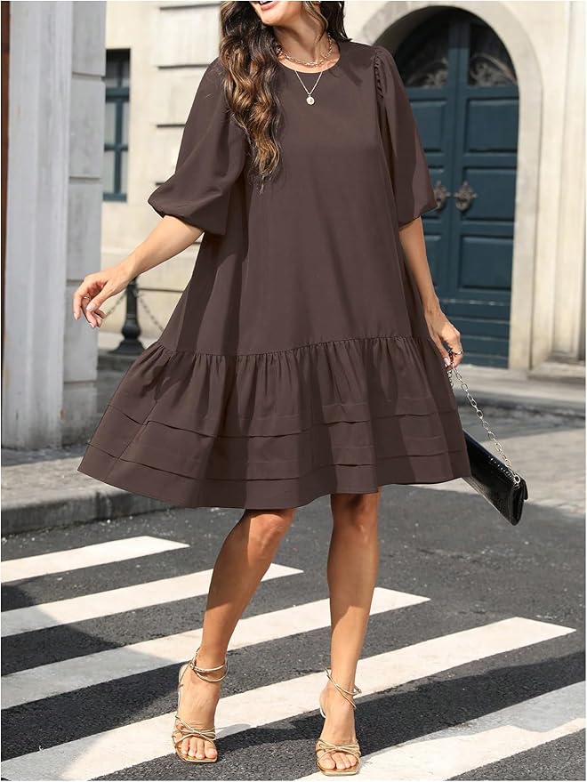 - Elegant dress for women features a tiered ruffle skirt and puffed sleeves that add a playful and feminine touch to the design, while the round neckline offers a timeless and classic appeal