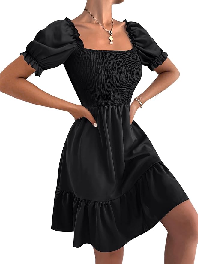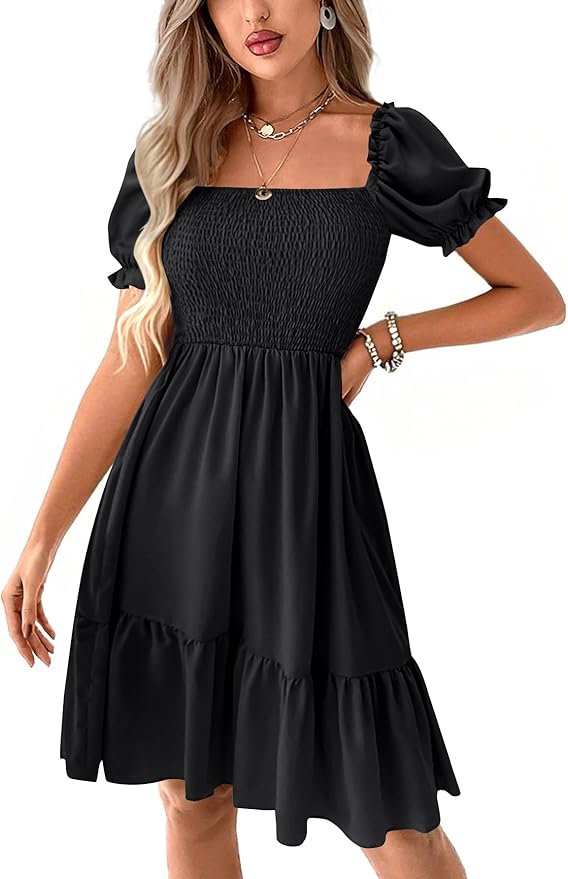 - Features: Square neckline, shirred, puff sleeves, a line, high waist, ruffle hem, layered casual mini dress.The unique design emphasizes the elegant temperament.